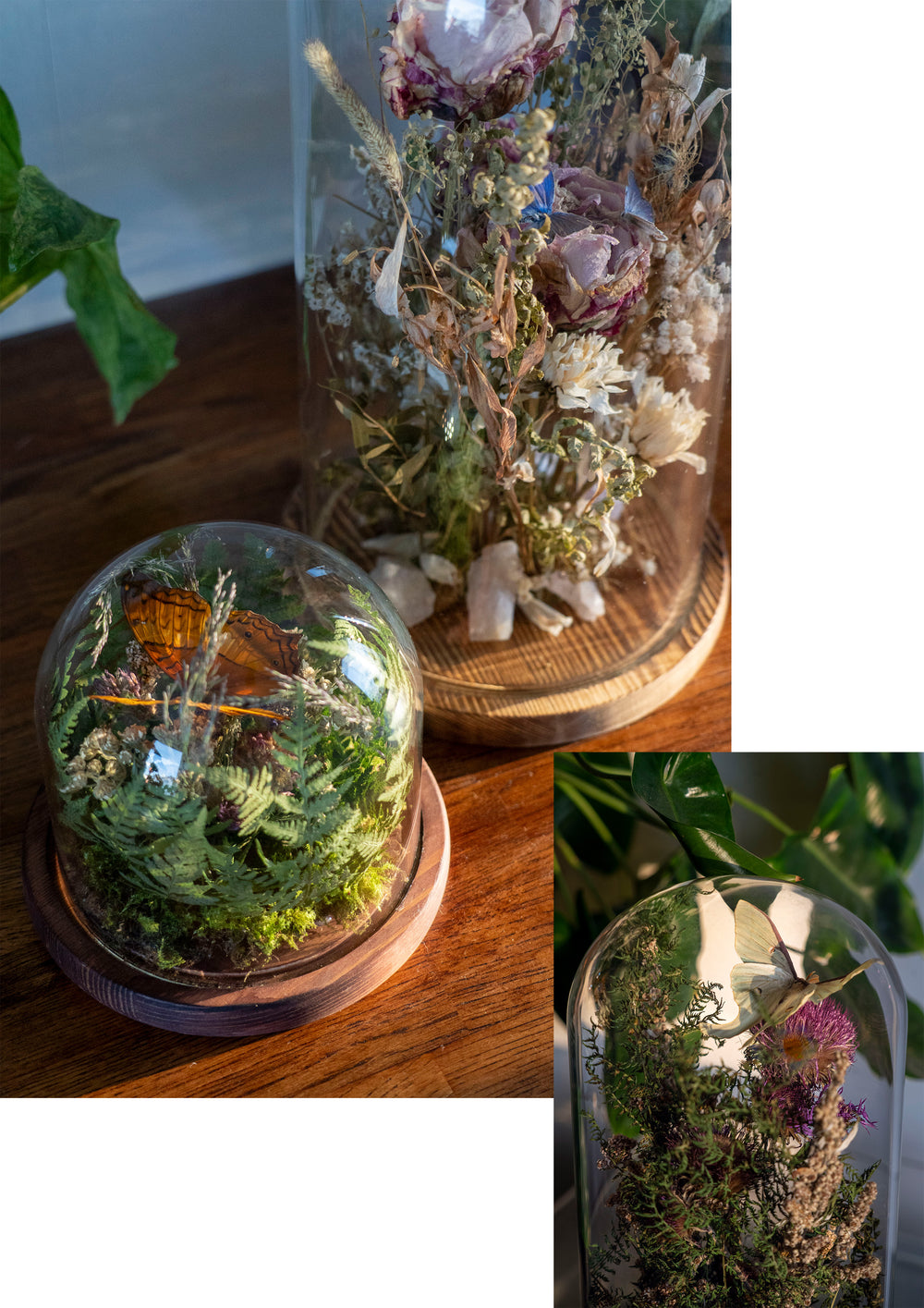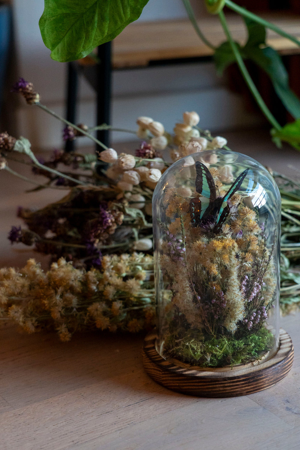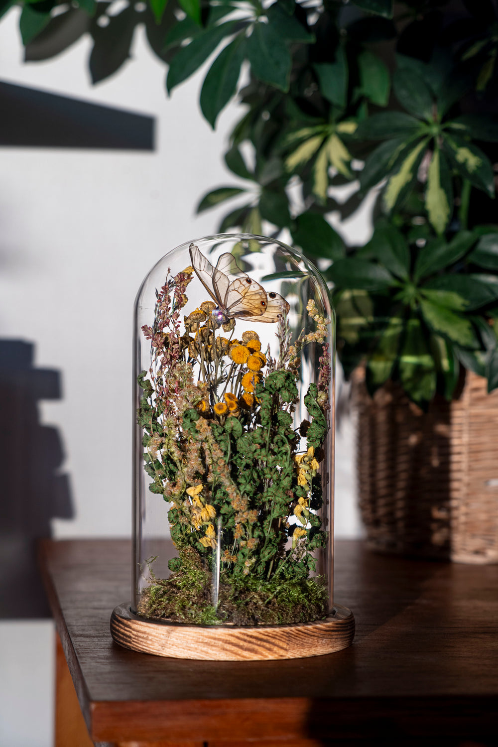 A delicate, refined composition featuring your select florals and a single focal butterfly—perfect for understated elegance. You can choose between a round dome (12cm by 15cm) or a long dome (10cm by 16cm)